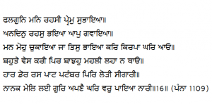 ਸਤਿਗੁਰੂ ਜੀ ਜੀਵ-ਇਸਤਰੀ ਦੀ ਪ੍ਰਤੀਨਿਧਤਾ ਕਰਦਿਆਂ ਫ਼ਰਮਾਨ ਕਰਦੇ ਹਨ ਕਿ ਫੱਗਣ ਦੇ ਮਹੀਨੇ ਵਿਚ ਮਨ ਅੰਦਰ ਕੁਦਰਤੀ ਖੁਸ਼ੀ ਉਪਜਦੀ ਹੈ।