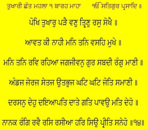 ਉਹ ਜੀਵ-ਇਸਤਰੀ ਜਿਸ ਦਾ ਗੁਰੂ-ਕਿਰਪਾ ਅਥਵਾ ਗੁਰੂ ਦੁਆਰਾ ਬਖ਼ਸ਼ੀ ਸੋਝੀ ਸਦਕਾ ਪਰਮਾਤਮਾ ਮਾਲਕ ਨਾਲ ਪਿਆਰ ਬਣ ਜਾਂਦਾ ਹੈ ਉਹ ਕਠਿਨ ਤੋਂ ਕਠਿਨ ਤੇ ਅਸਹਿ ਸ਼ੀਤ ਹਾਲਤ ਵਿਚ ਵੀ ਸੁਖੀ ਤੇ ਪ੍ਰਸੰਨਚਿਤ ਰਹਿੰਦੀ ਹੈ।